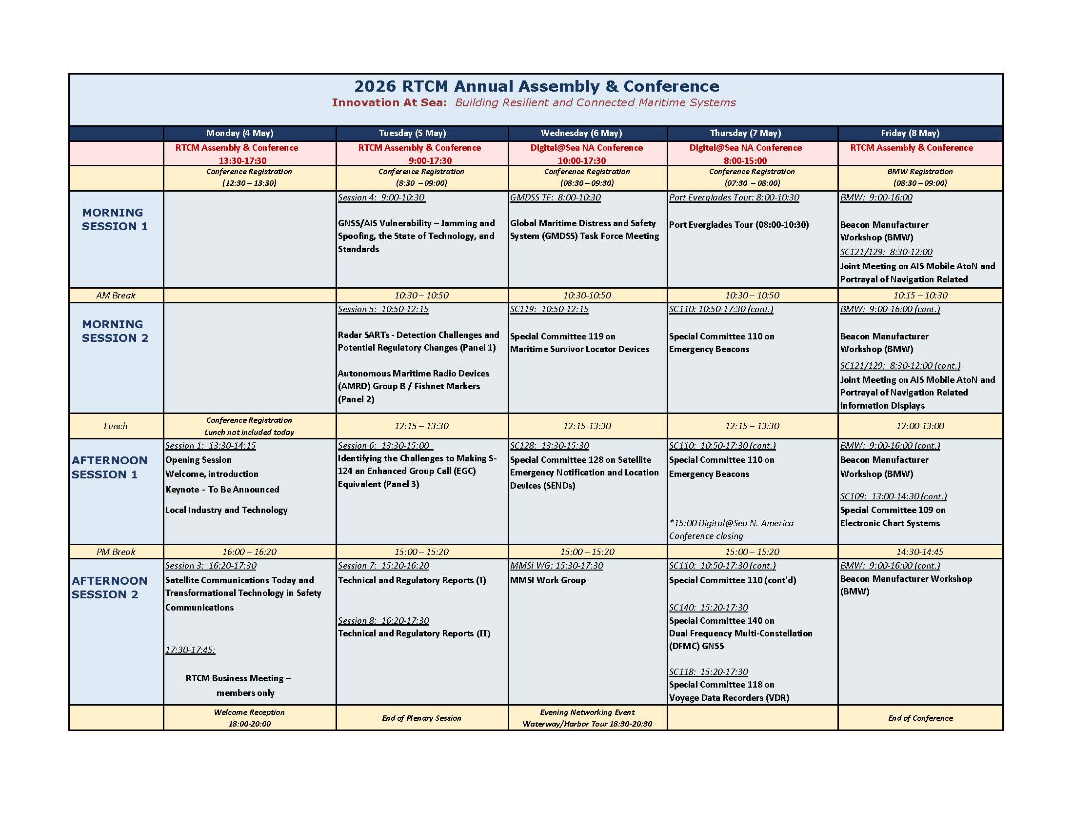RTCM Assembly & Conference Program DetailsConference Program OverviewThe Conference Program Overview is a one page view of the Conference meetings & activities. We will do our best to maintain the schedule as published; however, updates may occur as needed. Click on above link to see a full size PDF version of the below document